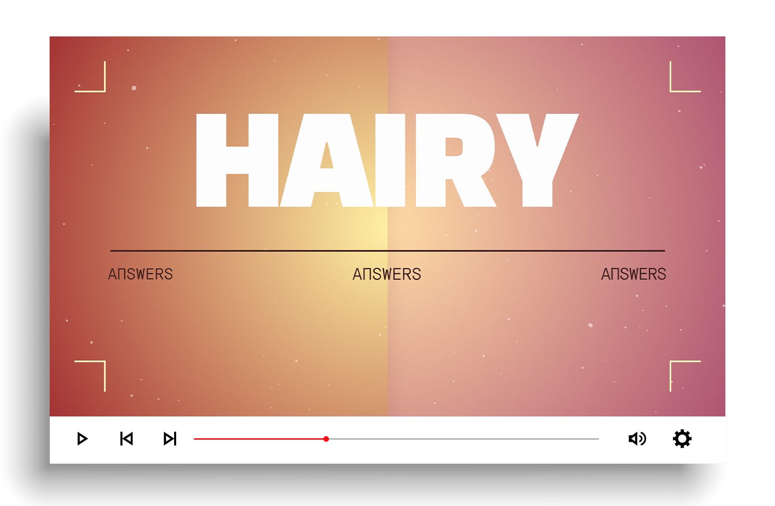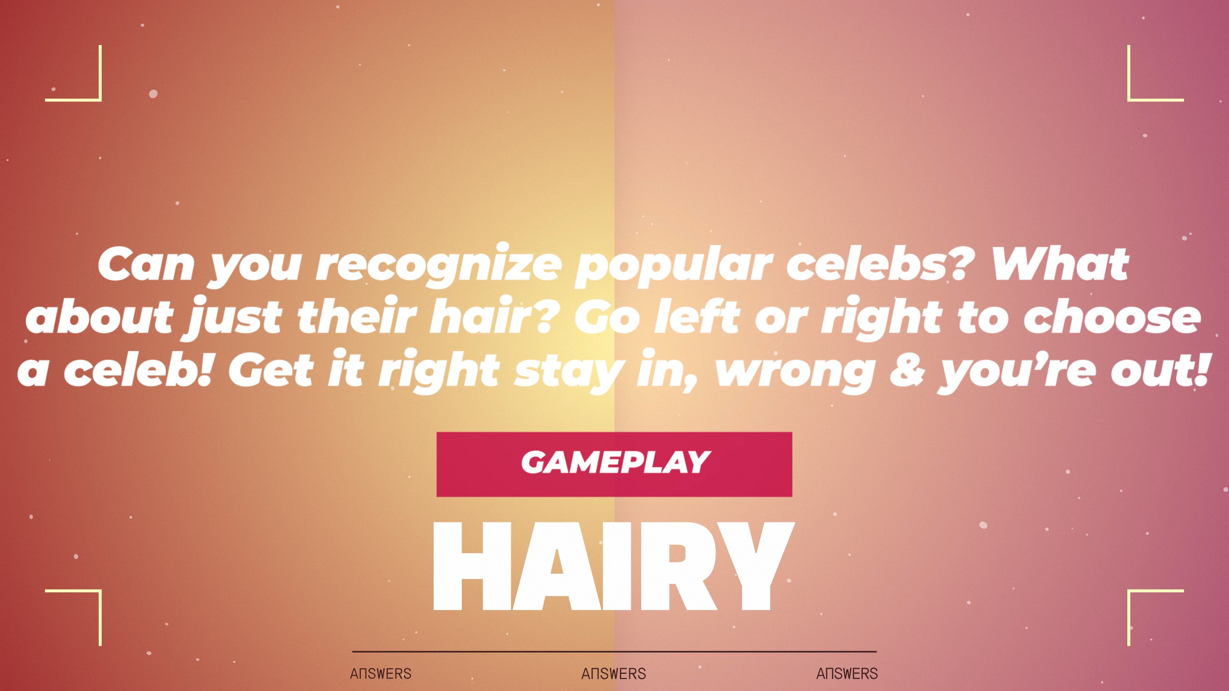 In Hairy Answers, a close-up image of a celebrity’s hair will appear on the screen, along with two possible celeb names. Players move to the left or right side of the room based on who they think it is. Choose correctly to stay in the game—guess wrong, and you’re out!