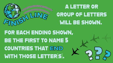 Test out your students geography knowledge with "FINISH LINE." The question slides with show a letter(s) and the goal is for the students to name at least 5 countries that END with that letter. Whether your students work in teams or as individuals, this game is great for building connections and introducing students to places they might not know!