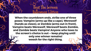 Halloween just got spooky competitive! Beat the Screen – Halloween Edition is a fast-paced twist on Rock, Paper, Scissors where everyone plays against the screen at once. Students will choose to act like a vampire, werewolf, or zombie — but only one will survive each round. It’s quick, it’s chaotic, and it will have your whole group howling with laughter!