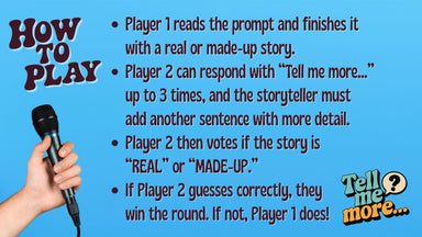 Think you can spot a tall tale—or sell one? In Tell Me More, players spin wild stories or true confessions while their opponent asks for more to dig deeper, and then makes the ultimate call: real or made-up?
