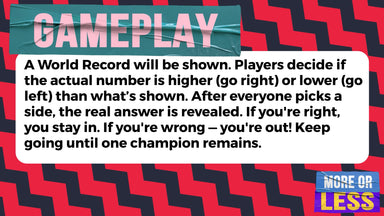 Think you know the extremes of the world? In More or Less, outrageous world records are put to the test as students guess if the real number is higher or lower than the one shown on screen. It's a fast-moving, brain-busting game of instincts and wild stats!