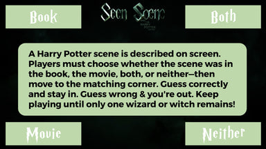 Wands at the ready! In Seen Scene – Harry Potter Edition, your students will put their wizarding knowledge to the test. Each round, a scene description is revealed—but was it in the book, the movie, both… or neither? It's a magical challenge full of twists, deep cuts, and maybe even a little trickery. Only the sharpest fans will survive!