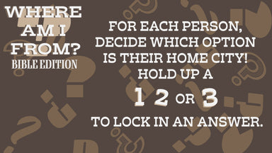 A scrambled word appears on the screen, and students race to unscramble it into its proper form. Each word is a name, place, or book in the Bible. The first person to shout out the correct word wins the round and earns a point. Each word tests player's Bible vocabulary, keeping students engaged and on their toes!