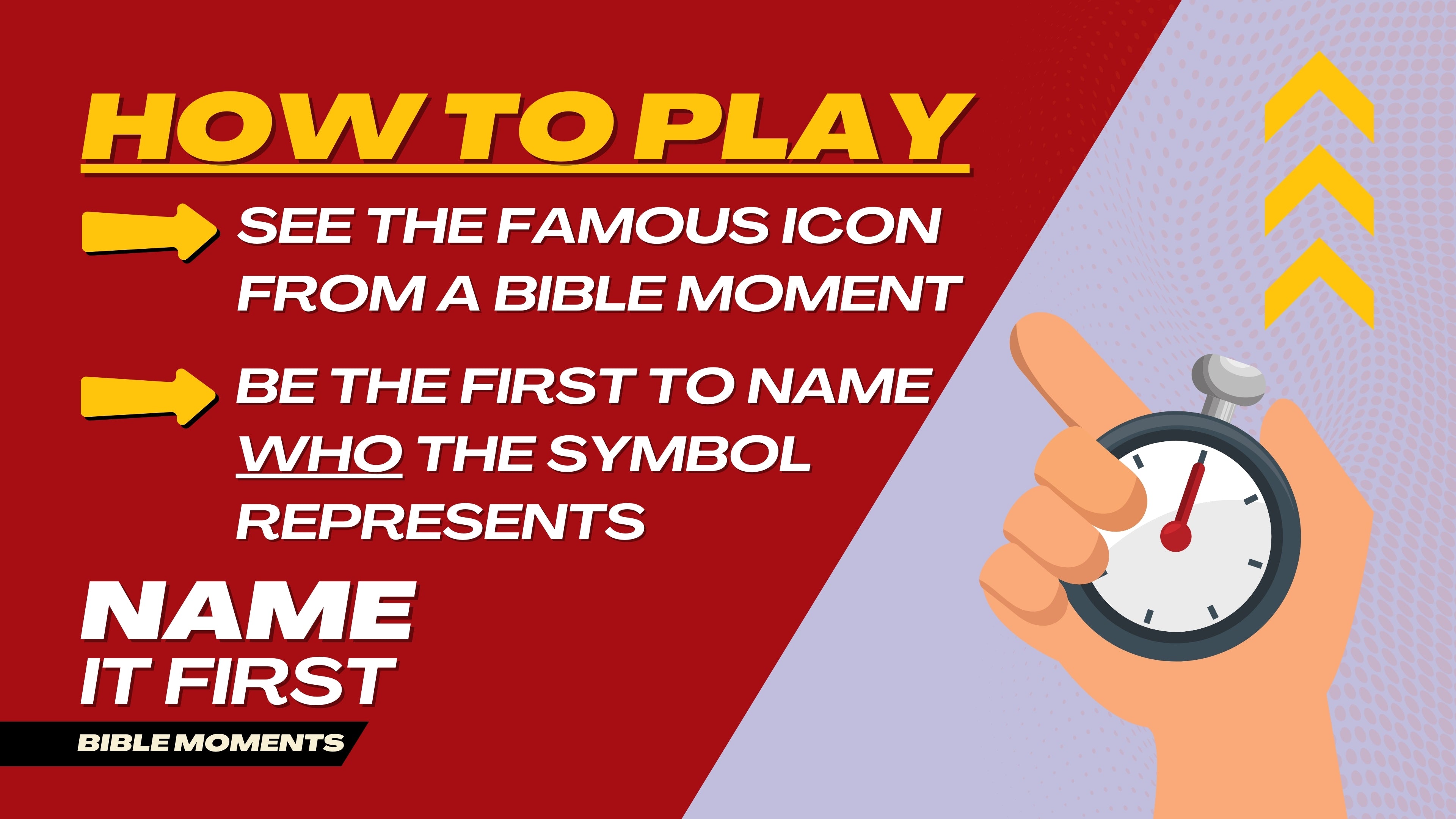 So many people from the Bible are connected to a symbol that reminds us of their moments within God’s Story. Invite players to face off onstage or as a room to to see who can guess the name of the person first!
