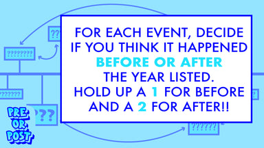 “Pre or Post!” is an energetic, fast-paced guessing game that keeps everyone on their toes  Each round begins with a  year flashing on the screen—say “1987!”—and players must quickly decide if a given event occurred before (“Pre”) or after (“Post”) that year. For example, if the event is “First episode of The Simpsons aired,” the correct answer would be BEFORE!