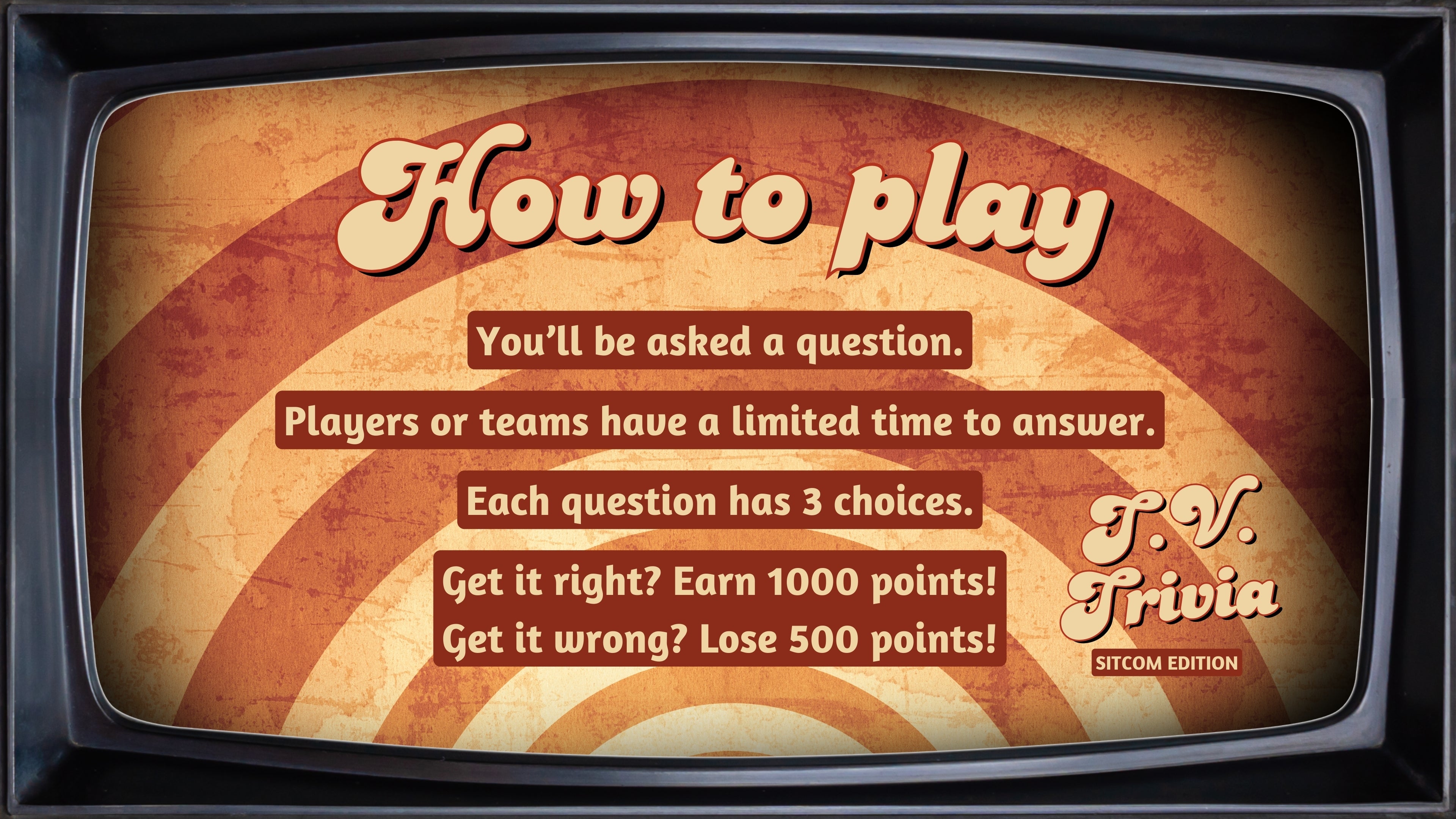 Raise your TV antennas for a trivia game where players dive into the world of classic TV! From old school fan favorites to Disney Channel hits, players will be challenged to guess the right answers to fun, nostalgic questions about the iconic characters, memorable moments, and catchy catchphrases from their favorite sitcoms. With multiple choice questions for every round, it's the perfect way to test your sitcom knowledge while reliving the shows that defined a generation!