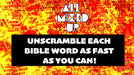 A scrambled word appears on the screen, and students race to unscramble it into its proper form. Each word is a name, place, or book in the Bible. The first person to shout out the correct word wins the round and earns a point. Each word tests player's Bible vocabulary, keeping students engaged and on their toes!