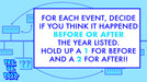 “Pre or Post!” is an energetic, fast-paced guessing game that keeps everyone on their toes  Each round begins with a  year flashing on the screen—say “1987!”—and players must quickly decide if a given event occurred before (“Pre”) or after (“Post”) that year. For example, if the event is “First episode of The Simpsons aired,” the correct answer would be BEFORE!