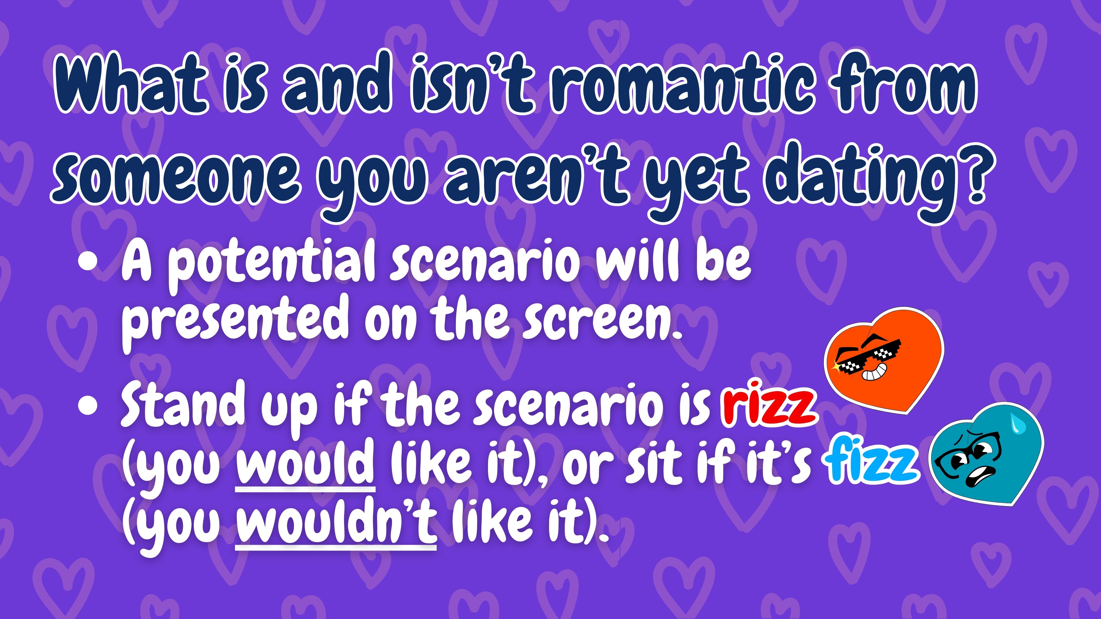 The ultimate romance debate continues! A scenario pops up on the screen—maybe someone likes every one of your social media posts, dedicates a song to you on the radio, or (brace yourself) feels comfy enough to toot in your presence. Is that a total RIZZ moment or an instant FIZZ? Stand up to vote, debate your choices, and get ready for some hilarious hot takes on romance!